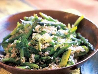 4. In steamer set over pot of boiling water, steam asparagus until tender, 4 minutes. Add peas during final 30 seconds of steaming. Add vegetables to bowl of bulgur along with mint and toss to combine. Serve at room temperature or chilled.