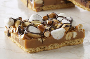 MICROWAVE caramel bits and milk in microwaveable bowl on HIGH 2 min. or until caramel bits are completely melted and mixture is blended, stirring every 30 sec. Pour over grahams; top with next 3 ingredients. Drizzle with chocolate.