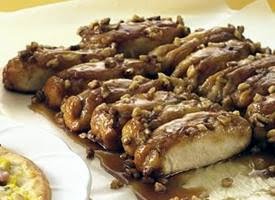 2)Separate dough into 20 biscuits. Press or roll each to from 4-inch round. Spoon 1 tablespoon cream cheese mixture down center of each round to within 1/4 inch of edge. Overlap sides of dough over filling, forming finger-shaped rolls. Arrange rolls, seam side down, in 2 rows of 10 rolls each over brown sugar mixture in pan.