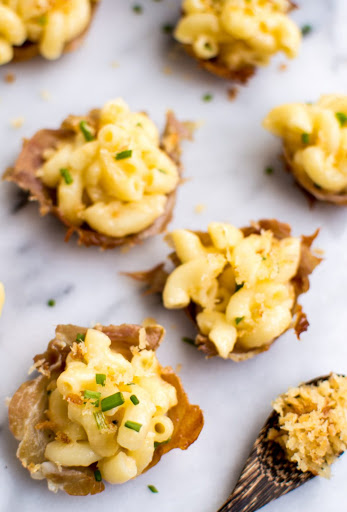 To assemble, spoon some mac and cheese into one of the prosciutto cups, and sprinkle on some of the prepared panko.