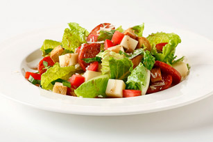 Cube the baguette and toss it with the romaine and pepperoni. Then, add the tomato mixture to the baguette mixture. Top with Kraft 100% parmesan shreds.