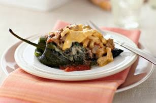 PREPARA los macarrones como se indica en el paquete. Incorpora 4 Singles y revuelve hasta que se derritan. Entretanto, dora la carne con la cebolla picada en una sartén grande; escúrrela. Incorpora la mezcla de carne y el cilantro restante a los macarrones que preparaste; rellena los chiles restantes con esto. Pon los chiles rellenos sobre la salsa en la fuente para hornear; cúbrelos con la salsa restante. Tápalos.
