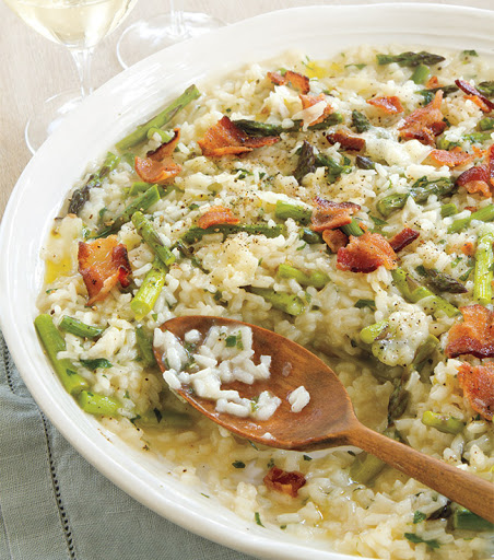 NEXT Add 1⁄2 cup of warm broth to rice, stirring until nearly absorbed. Continue adding broth, 1⁄2 cup at a time, stirring until absorbed after each addition, until rice is creamy and slightly tender, 20 to 25 minutes. Stir in asparagus, parsley, mint, lemon juice, and any remaining broth. Season with salt and pepper; stir in 2⁄3 cup Parmesan.