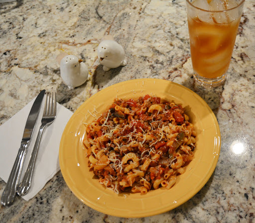 Brown hamburger with onions and green peppers, drain. Add remaining sauce ingredients to mixture. Simmer ten minutes. Add macaroni, mix well.