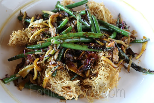•Half-fill a wok or deep, heavy-bottom skillet with oil. Add the noodles, in batches, and cook for 2 minutes, or until crisp and puffed up. Remove and drain on paper towels. Pour off all but 2 tbsp of oil from the wok.