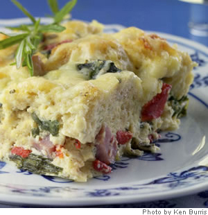 Whisk eggs, egg whites and milk in a medium bowl. Add mustard, rosemary and pepper; whisk to combine. Toss spinach, bread, ham and roasted red peppers in a large bowl. Add the egg mixture and toss well to coat. Transfer to the prepared baking dish and push down to compact. Cover with foil.