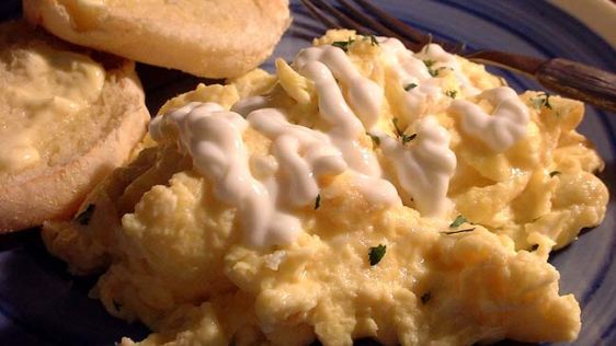 Stir over a medium heat until the eggs start to cook. Remove from heat continue stirring eggs for about 20 second. Return to heat, continue to stir eggs until they start to clump, remove from heat and add the creme fraiche. Return to heat stirring in crème fraiche.