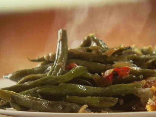 Melt the bacon grease in a skillet over medium-low heat. Add the garlic and onions and cook for a minute. Then add the green beans and cook until the beans turn bright green, about a minute. Add the chicken broth, chopped red pepper, salt and pepper to taste. Turn the heat to low and cover the skillet with a lid, leaving the lid cracked to allow steam to escape. Cook until the liquid evaporates and the beans are fairly soft, yet still a bit crisp, 20 to 30 minutes. You can add more chicken broth during the cooking process, but don't be afraid to let it all cook away so the onions and peppers can start to caramelize.