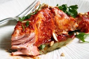 COCINA los ajos en una sartén pequeña a fuego medio-alto por 10 min. o hasta que esté tostado, volteándolo de vez en cuando. Pélalos y reserva. Calienta el horno a 350ºF. Remoja los chiles en agua caliente por 10 min. o hasta que se ablanden; escúrrelos y reserva 1/4 taza del líquido. Pon los chiles y su líquido en la licuadora. Añade el aderezo, 1/4 de taza de almendras y el ajo que reservaste; licúalos hasta que queden cremosos. Vierte la mezcla sobre el pescado en un tazón grande; revuelve para cubrirlo bien con la salsa.