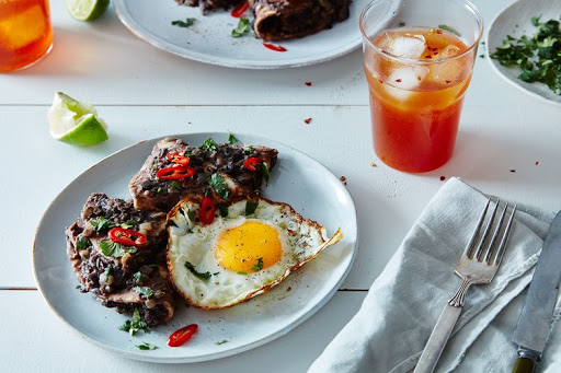 In the same hot skillet, heat a few tablespoons of oil and quick-fry an egg per person till crispy on the bottom and mostly-set on top. Dole out about 3 enfrijoladas per person, top with the egg, and garnish.