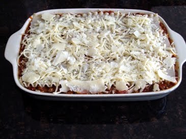 4) Put together lasagna – Layer #1: sauce, noodles, mozarella, paremesan/Layer #2: sauce, noodles, ricotta, parmesan/Layer #3: sauce, noodles, mozzarella, parmesan