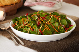 - 8 cups packed baby spinach leaves 1 red pepper, cut into thin strips 1 cup thin matchlike carrot sticks 1 green onion, thinly sliced 1/2 cup chow mein noodles 1/3 cup Kraft Signature Asian Sesame Dr