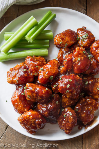 Place chicken bits on a cookie sheet. Bake in 200 degrees Celsius oven for 18 minutes.