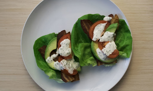 Build wraps with lettuce, basil, bacon, avocado, tomato, and lemon cream.