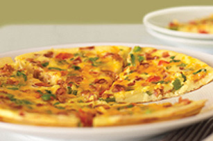 PREHEAT oven to 400ºF. Beat eggs and cream cheese spread with wire whisk until well blended; set aside. Spray 10-inch ovenproof nonstick skillet with cooking spray. Add peppers to skillet; cook and stir 2 min. or until crisp-tender.