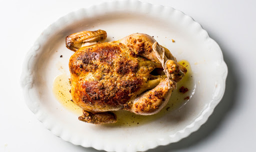 Place chicken in oven and pour ½ cup water into baking sheet (this will prevent juices from scorching). Roast until skin is dark golden brown and an instant-read thermometer inserted into the thickest part of a thigh registers 165°, 45–55 minutes. Transfer to a cutting board; let rest at least 10 minutes before carving.