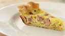 In a medium bowl, whisk together eggs and egg whites, milk, 1/2 teaspoon salt, and 1/4 teaspoon pepper. Stir in onion, ham, and Swiss. Pour mixture into crust and bake on top rack until center is just set, about 25 minutes. Serve warm or at room temperature.