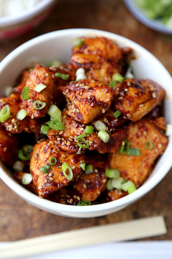 Transfer Korean sticky chicken to a bowl or a plate and top with chopped scallions. Serve immediately with rice.