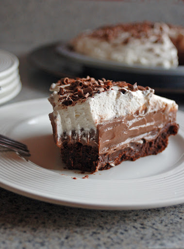 To assemble the pie, make sure your brownie crust is at room temperature. Add the chilled pudding on top of the brownie crust. Top the pudding with your whipped cream. To make chocolate curls for the garnish, use a vegetable peeler to peel along a straight edge of your chocolate square. Make as many curls as you wish and scatter them on top of the pie.