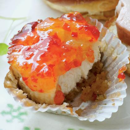 4. Bake at 350° for 10 minutes or until set. Cool completely in pans on a wire rack (about 20 minutes). Spoon 1 tsp. melted green pepper jelly over each of 12 cheesecakes. Spoon 1 tsp. melted red pepper jelly over remaining 12 cheesecakes. Cover and chill 2 to 12 hours before serving.