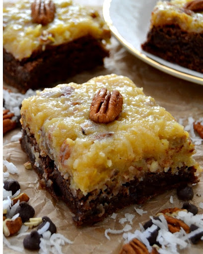 While brownies cool, make your frosting. In a large saucepot, bring together the evaporated milk, sugar, egg yolks, cubed butter, and vanilla over medium heat until melted. Bring the mixture to a bubble/boil and, stirring constantly, boil for 12 minutes exactly or until thickened. Remove from heat after 12 minutes and stir in the coconut and chopped pecans. Cool for about 15 minutes.