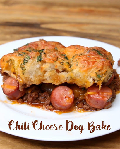 9. In the bottom of a 9×13 glass baking dish, layer the chili, hot dogs, and biscuits.