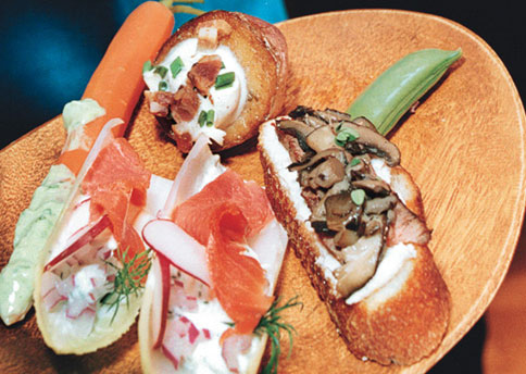 4.Place potatoes, cut side up, on platter (slice off rounded end to make flat, if necessary). Top each with dollop of crème fraîche, then bacon and chopped chives. Serve warm or at room temperature.