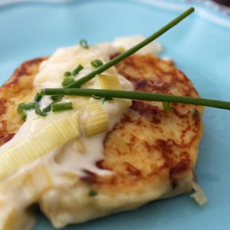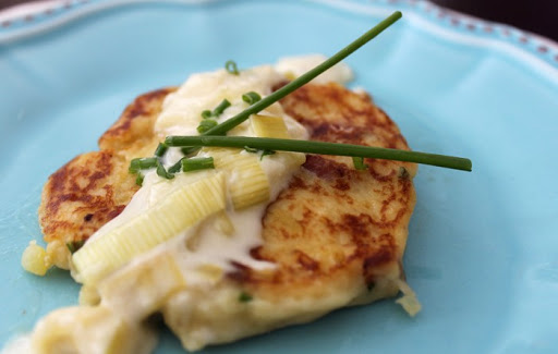 Leeks lend a delicate flavor to these potato cakes, and the creamy topping provides a cool, savory contrast.