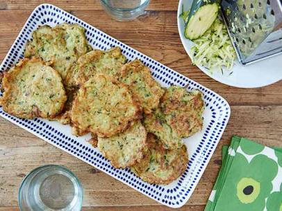 2. Grate the zucchini into a bowl using the large grating side of a box grater. Immediately stir in the onion and eggs. Stir in 6 tablespoons of the flour, the baking powder, salt, and pepper. (If the batter gets too thin from the liquid in the zucchini, add the remaining 2 tablespoons of flour.)