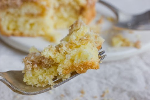 Preheat the oven to 350°. Thoroughly coat a tube pan with nonstick cooking spray. Press the dough (it will be very sticky) evenly into the pan. Top the dough with the streusel mixture. Bake for 40 - 45 minutes, until the streusel is golden and the cake is cooked through. Allow to cool for five minutes, then carefully remove the cake from the tube pan (slip a knife around the edges of the cake and beneath it). Serve warm, with coffee.