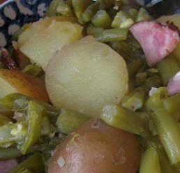 Combine all ingredients in a large pot, bring to a boil, then turn to medium low and cook about 1 1/2 hours until potatoes are done and water has cooked down. You can also do this in the crockpot and let cook on low 6 to 7 hours or high 4 hours.