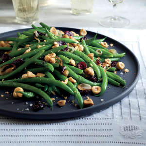 5. Heat a large skillet over medium heat. Add oil to pan; swirl to coat. Add shallots; cook 5 minutes or until lightly browned. Add beans; cook 3 minutes or until thoroughly heated, stirring occasionally. Add cranberries and hazelnuts; cook 1 minute. Sprinkle with salt and pepper.