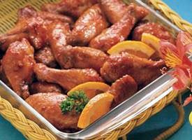 Heat oven to 375 degrees. Drain chicken wings, reserving marinade. Place chicken on broiler pan. Bake at 375 for 45 to 60 minutes or until chicken is no longer pink, brushing occasionally with reserved marinade. Discard any remaining marinade. Serve Warm.