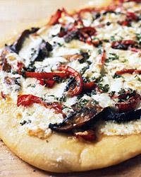 Spread the peppers and mushrooms on the pizza crust. Bake for 12 minutes. Sprinkle on the garlic, black pepper, and basil. Top with the mozzarella and then with the Parmesan. Drizzle with the remaining 3 tablespoons oil. Bake until the cheese is bubbling and beginning to brown, about 10 to 15 minutes longer.