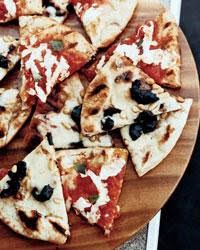 On a lightly oiled work surface or sheet pan, press 1 dough ball into a thin, roughly shaped, 10-inch round. Repeat with the remaining dough balls. Carefully set 1 dough round over the hot fire and grill until firm on the bottom and easy to lift, about 1 minute. Using tongs, move the crust to the medium-hot fire and continue grilling until the bottom is deeply browned and blistered, about 2 minutes longer. Carefully flip the crust and return it to the hot fire until cooked through, about 1 minute.