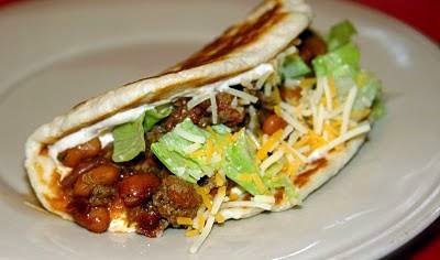 In a large skillet, brown beef & drain. Add the beans, tomatoes, taco seasoning, cayenne, garlic salt, and salsa. Heat thoroughly until done with the tortillas.