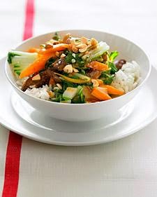 3. To skillet, add soy mixture, bok choy, and carrots. Cover and cook, tossing occasionally until tender, about 5 minutes. Return steak to skillet; cook until heated through, about 5 minutes. Serve over rice; sprinkle with peanuts.