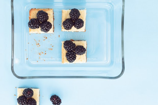 3. Using foil overhang as aid, lift cheesecake from pan. Cut into 16 squares; arrange on platter. Top each square with berries. Chill until ready to serve, up to 3 hours. Serve chilled.