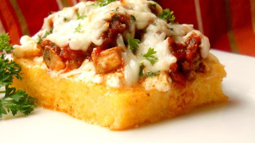 Remove the polenta from its package, and cut into 1/2-inch slices. Lay the slices in a single layer in a 9x12-inch baking dish. Top each polenta slice with a tablespoon or two of the chive cottage cheese (use all the cottage cheese). Pour the sauce evenly over the cottage cheese, and sprinkle with the mozzarella cheese.