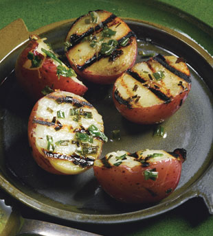 3. Coat grill rack with nonstick spray. Prepare barbecue (medium-high heat). Grill potatoes, cut side down, until cut side is crisp and brown, 10 to 12 minutes. Rewarm remaining chive butter. Transfer potatoes, cut side up, to platter. Drizzle with warm chive butter.