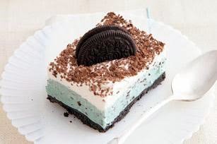 FREEZE 3 hours. Remove from freezer 15 min. before serving. Let stand at room temperature to soften slightly. Lift dessert from pan with foil handles; cut into 16 squares. Cut remaining cookies in half; place 1 on each square.