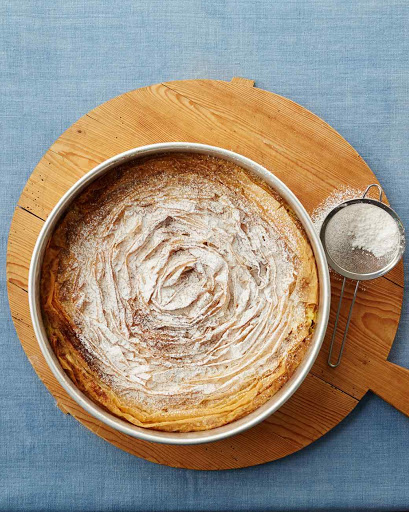 5. Spoon milk mixture over baked phyllo, evenly covering surface. Return pan to oven and bake until filling has set, 25 to 30 minutes more. Dust with confectioners' sugar and cinnamon; serve immediately.