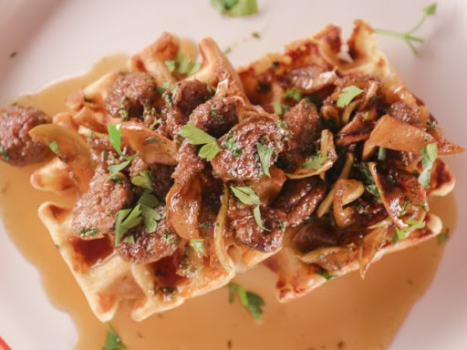 Cheddar-Black Pepper Waffles with Sausage and Apples Maple Agrodolce