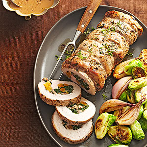 Preheat oven to 350 degrees F. Spread the stuffing evenly over the meat. Roll meat into a spiral, starting from a short side. Tie roast in three or four places with heavy 100-percent-cotton kitchen string. Place roast on a rack in a shallow roasting pan. Sprinkle with thyme, salt, and pepper. Insert an oven-going meat thermometer into center of roast. Roast, uncovered, for 1 hour to 1 1/2 hours or until thermometer registers 145 degrees F, covering ends of meat after 45 minutes to prevent stuffing from drying out. Transfer roast to a serving platter. Cover loosely with foil; let stand while preparing gravy.