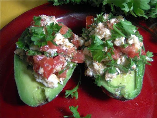Mix all ingredients, except avocados, in bowl.