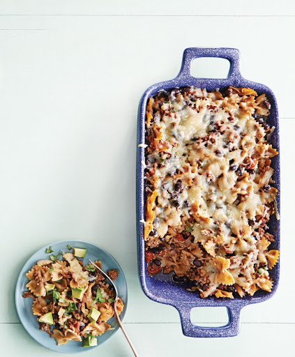 Spread half of beef-pasta mixture into baking dish, and sprinkle with half of cheese. Top evenly with remaining beef-pasta mixture and cheese. Bake until cheese is melted and sauce is bubbling, 12–14 minutes. Let cool for 10 minutes. Garnish with avocado and cilantro. Serve with lime wedges (if using).