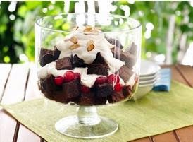 Cut brownies into one inch pieces. In 3-quart glass bowl, layer half of the brownies; top with cherry pie filling and half of the whipped cream. Top with remaining brownies and whipped topping; sprinkle with almonds. Cover; refrigerate at least 2 hours but no longer than 24 hours before serving. Store covered in refrigerator