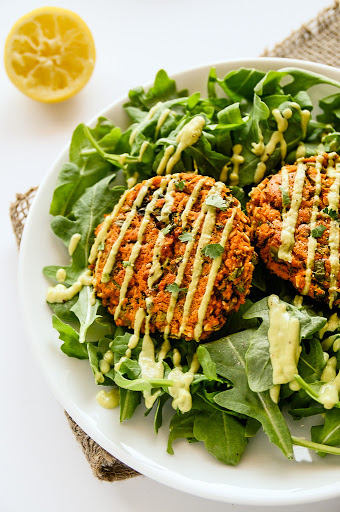 Sweet Potato & Lentil Cakes with Lemony Avocado Sauce