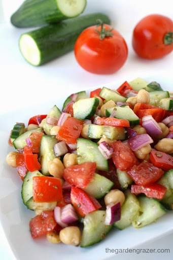 Dice the cucumber, onion, bell pepper and tomatoes (removing any excess liquid from tomatoes).