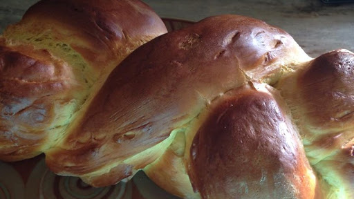 Cut the dough into 3 or 4 even portions and roll into long ropes. Braid and tuck the ends under. Place the loaf on a baking sheet and cover loosely with plastic wrap. Set in a warm place to rise. Bread is ready to bake when your finger leaves an impression in the dough.